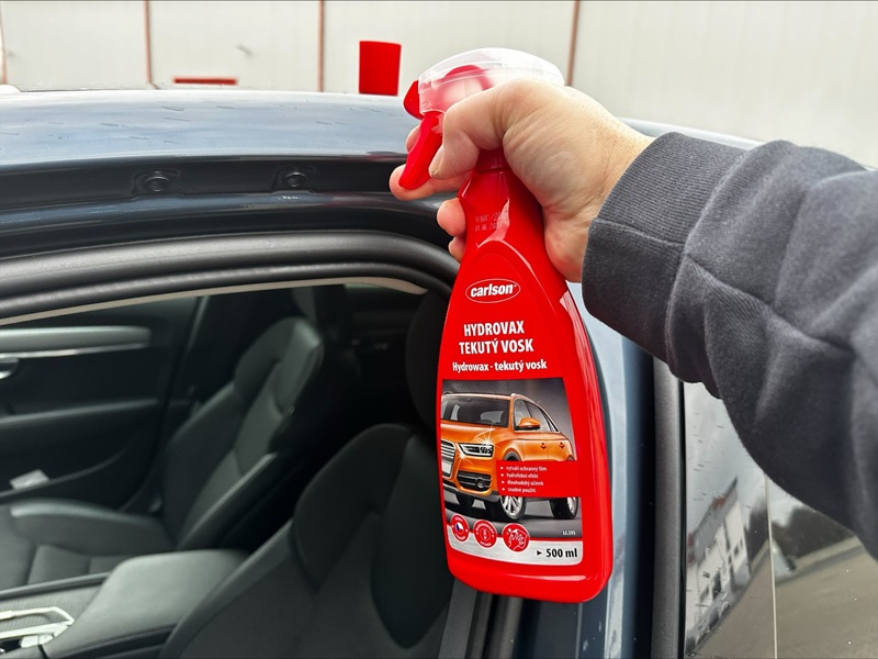 2) Použití vosku: vyzkoušeli jsme Carlson Hydrovax tekutý vosk: Vosk může fungovat jako účinný prostředek proti přilepení těsnění dveří. Naneste tenkou vrstvu vosku na povrch pryžových těsnění. V tomto případě jsme použili vosk s rychlou aplikací Carlson Hydrovax tekutý vosk, který můžete zakoupit ZDE. Při aplikaci se ujistěte, že vosk neobsahuje abrazivní částice, které by mohly povrch těsnění poškodit. Tento typ aplikace pomocí vosku používejte pouze v krajních případech. Doporučujeme variantu se silikonovým olejem a aplikační houbičkou, nebo silikonovým olejem, kde pro aplikaci použijeme rozkrojenou houbičku. O této aplikaci se dočteme níže v článku. Carlson Hydrovax tekutý vosk je vyrobený pro jiné účely a funguje jako výborná a rychlá ochrana karoserie.