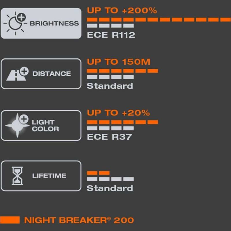 OSRAM NIGHT BREAKER® 200% - kvalita světla hraje důležitou roli v bezpečnosti silničního provozu. Jasné zorné pole a vysoká viditelnost mohou výrazně zlepšit vaši schopnost řídit v noci. S jasem o 200% vyšším je nový Osram Night Breaker 200 zdaleka nejjasnější halogenovou autožárovkou na světě.