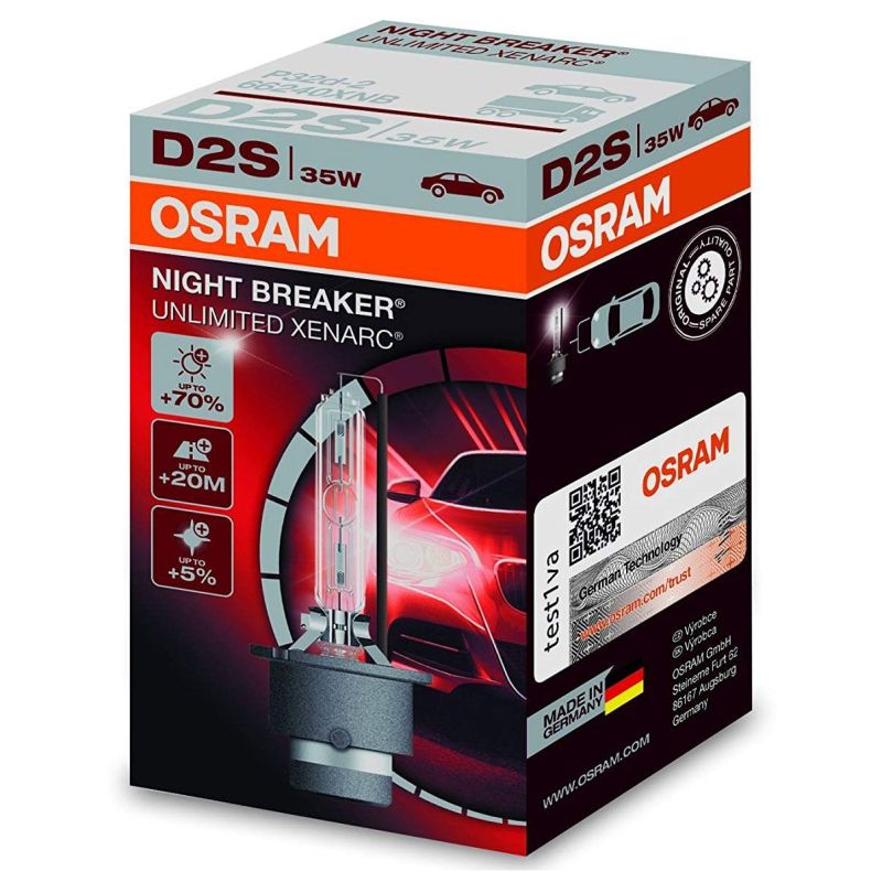 OSRAM XENARC® NIGHT BREAKER® UNLIMITED - nejsilnější xenonová výbojka OSRAM. Tyto výkonné světelné zdroje s účinnou xenonovou technologií dodávají maximální světlo na silnici. Až o 70 % více světla ve srovnání se standardními xenonovými výbojkami. To znamená lepší viditelnost a kratší reakční dobu řidiče před překážkou. Navíc vytváří až o 20 m delší kužel světla a až o 5 % bělejší světlo než standardní xenonové výbojky. Objevte čistý výkon XENARC NIGHT BREAKER UNLIMITED – nejsilnější xenonovou výbojku OSRAM. Xenonová výbojka D2S od renomovaného německého výrobce Osram v originální kvalitě prvovýroby pro automobilky, jedná se o západoevropskou edici s prodlouženou životností, nikoli o východoevropskou edici. UV filtr pro dokonalou ochranu parabol světlometů před oxidací. Patice PK32d-2, svítivost +70%, dosvit +20m, barva světla bílá laser +5%, životnost standardní, odolnost vůči otřesům standardní, výkon 35W, teplota světla 4500 Kelvinů, světelný tok 3200 lm.