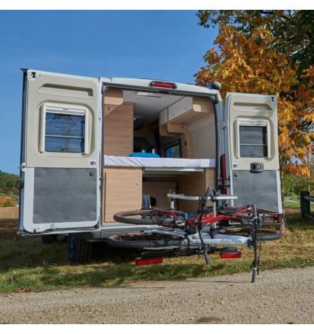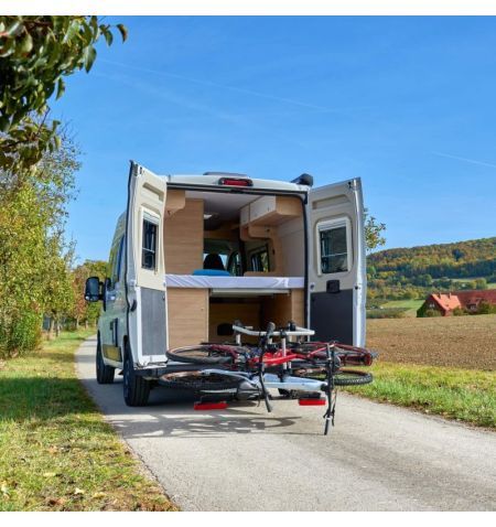 nejkvalitnější nosiče na trhu, výroba Německo, vhodný pro dodávky a auta s velkými zadními dveřmi, moderní sklopný nosič s robustní konstrukcí pro 2 jízdní kola nebo elektrokola, snadné skládání, ochrana karbonových rámů kol, miniaturní rozměry ve složeném stavu
