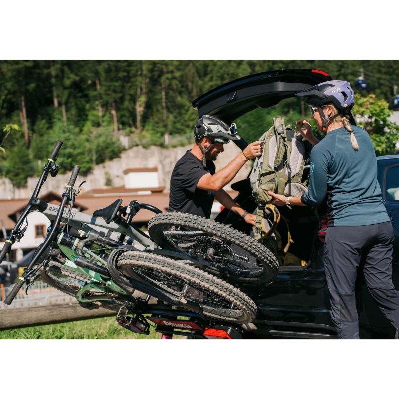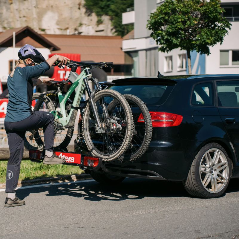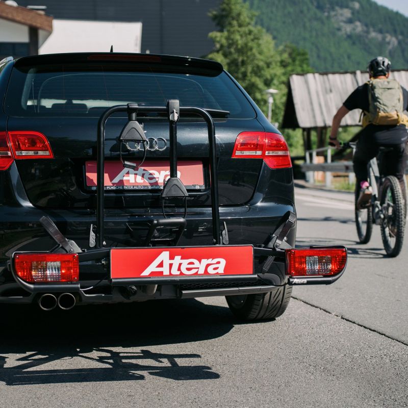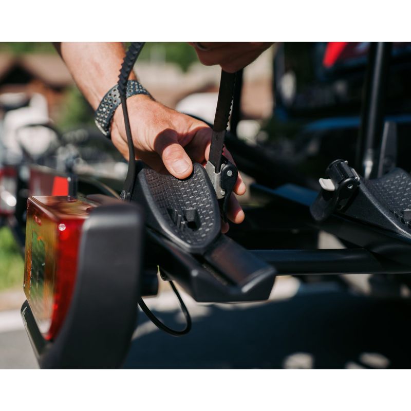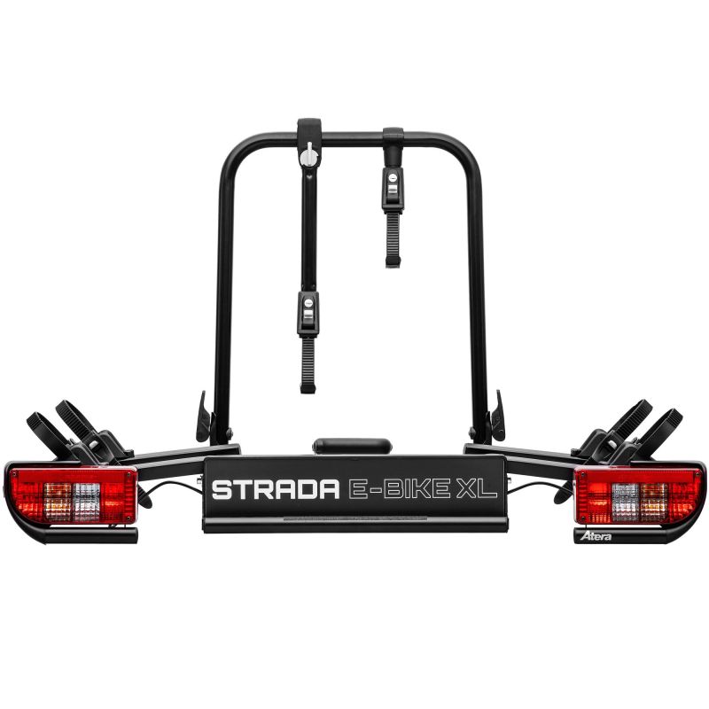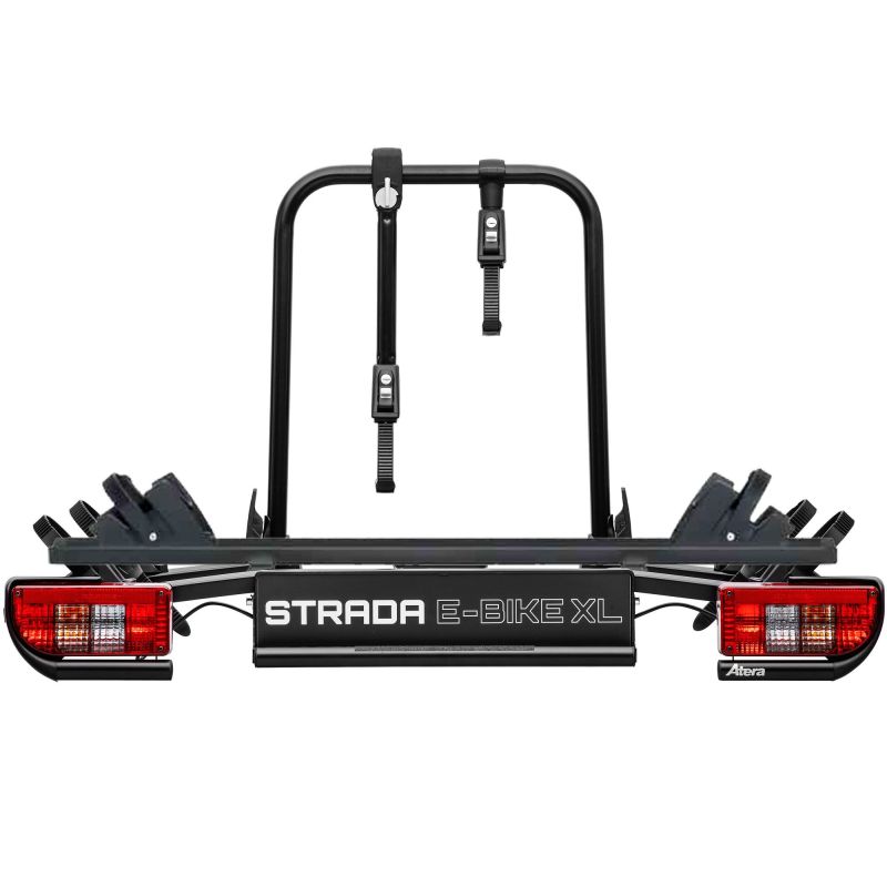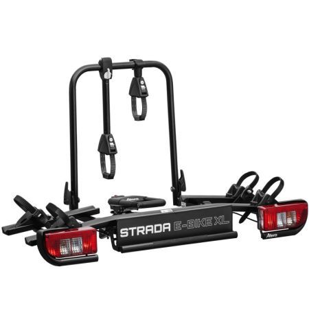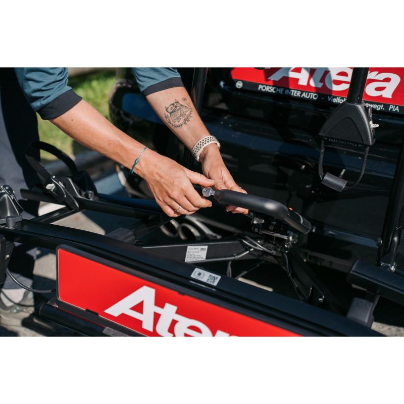 Extra široký nosič kol na tažné zařízení s délkou ližin 120cm - to je nový typ Strada Sport E-Bike XL od renomovaného německého výrobce Atera pro přepravu 2+1 jízdních kol / elektrokol / koloběžek včetně adaptéru na třetí kolo. Inovovaná verze s novým typem širších dosedacích klínků s novou texturou povrchu, které umožňují možnost vložení širších pneumatik jízdních kol. Dlouhý popruh ve standardu umožňuje vložení pneumatiky až do šířky 4 palce. Nosič je vhodný jak pro běžná jízdní kola a elektrokola, tak také pro kola s velkým rozvorem, případně i pro mnoho typů koloběžek a fatbike. Rozšířený prostor mezi ližinami na 23cm umožňuje přepravovat robustní elektrokola s velkou šířkou nebo sjezdová kola s širokou vidlicí. Nosič vyniká extrémně pevnou a lehkou konstrukcí z aluminia, prezentuje se dokonalou antikorozní ochranou a ochranou proti odření. Maximální nosnost nosiče je 59.2kg, při použití držáku na třetí kolo je povolená nosnost dokonce 68kg, což je téměř nejvyšší hodnota mezi nosiči na tažné zařízení. Špičkový nosič kol / elektrokol na tažné zařízení Atera Strada E-Bike XL přepraví kola s maximální hmotností 30kg. Úchyt rámů kol je skvěle vyřešen pomocí pryžových pásek vyztužených zalisovaným kovovým páskem bránícím přestřihnutí nebo přeřezání a tím snadné krádeži kola. Nosič nabízí možnost uchycení rámů kol s průměrem 25-80mm, dotažení se provádí ráčnou s přepěťovou ochranou bránící přetažení rámu kola. Nosič nabízí také možnost upínat karbonové rámy kol bez nebezpečí poškození nadměrným tlakem. Bezpečné uchycení kola je zajištěno díky obejmutí celého rámu dokola. Držáky rámů kol jsou posuvné po hrazdě, nesnímatelné. Každý držák rámu kola je vybavený odolným zámkem. Nosič vhodný pro kola do rozměru 29 palců a všechny běžné šířky ráfků a pneumatik. Nastavení klínových žlábků lze pro pneumatiky dle velikosti kola, dotažení pásku pomocí páčky ráčnovým způsobem. Hrazdu je možné po povolení 2 excentrických páček sklopit na základnu nosiče pro snadné uložení do zavazadlového prostoru vozidla. Upínání je řešeno pomocí pákového mechanismu s pojistkou. Nastavení síly dotažení se provádí stlačením uzamykatelné páky ve 4 možných úrovních, ve většině případů je dostatečný první stupeň stlačení. Správné dotažení signalizuje nosič klapnutím a vysunutím indikátoru na upínacím mechanismu. Pokud není páka správně dotažena v některé z úrovní, nelze nosič uzamknout. Nosič se odklápí klasickým způsobem od zádi vozidla a umožňuje tak pohodlný přístup do zavazadlového prostoru. Odjištění odklápění se provádí zatáhnutím za madlo mezi svítilnami nosiče.