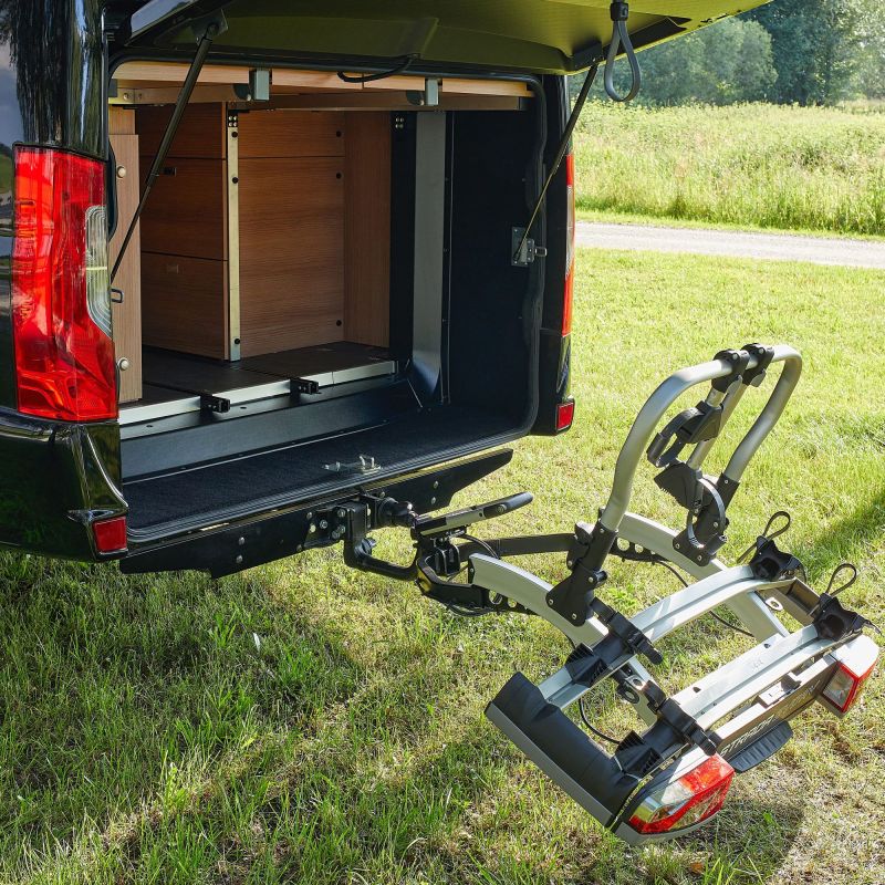 německý špičkový aluminiový nosič kol se SMD-LED diodovými lampami na tažné zařízení pro 2 kola nebo elektrokola, lze rozšířit pomocí adapterů až na kapacitu 4 kol, vhodný také pro dodávky, k nosiči je nutné zakoupit základnu MFT Back Carrier