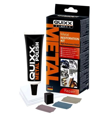 Sada Quixx Metal Restoration Kit je dokonalým produktem, který obnovuje špinavé nebo poškrábané kovové povrchy do jejich původního vzhledu. Sada je vhodná pro lesklé i matné kovové povrchy jako zlato, stříbro, platina, chrom, titan, nerezová ocel, hliník, hořčík, mosaz, měď a nikl. Vysoce výkonný leštící koncentrát nejen čistí a leští povrch, ale také zanechává silnou ochrannou vrstvu, která poskytuje dlouhodobý lesk, chrání před poškrábáním a nečistotami. Sada je vhodná pro vysoce lesklé, matné nebo kartáčované kovové povrchy. Jednoduchá, rychlá a efektivní aplikace. Poskytuje zářivý lesk u povrchů ze zlata, stříbra, platiny, chromu, titanu, nerezu, hliníku, hořčíku, mosazi a u mnoha dalších kovů. Dokonale odstraňuje známky použití, malé škrábance, oxidaci, rez a oděrky. Vyhýbá se nákladným opravám a udržuje hodnotu předmětů a součástí. Sada all-inclusive obsahuje veškeré příslušenství, které potřebujete pro provedení opravy. Obsah - 1x role leštícího papíru, brusný papír s hrubostí 1000 / 2000 / 5000, 1x brusný blok, 4x profesionální lešticí utěrka. Určeno pro profesionální použití. Vyrobeno v Německu.