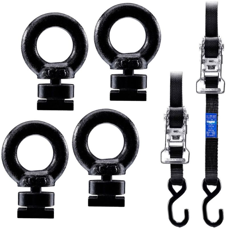 čtyři zábrany, přemění střešní plošinu Thule Caprock M na univerzální koš na zavazadla, zajišťuje tašky / chladicí boxy / kontejnery, drážky ve tvaru T s dalšími body pro přivázání a zajištění