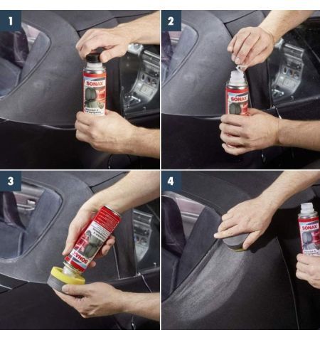 Střechy kabrioletů - střechu nejprve vyčistěte čističem střech kabrio, důkladně opláchněte a nechte vyschnout. Nastříkejte na aplikační houbičku a aplikujte na suchou střechu a rovnoměrně rozetřete. V případě potřeby po krátkém vysušení postup zopakujte. Vnitřní prostory - ošetřované plochy vyčistěte čističem interiéru nebo pěnou na čalounění a nechte vyschnout. Poté je postup stejný jako v předešlém případě. Používejte pouze v dobře větraných prostorách. Před aplikací otestujte stálost barev a otěru na nenápadném místě. Neaplikujte na přímém slunci nebo na rozpálený povrch. Chraňte před mrazem.